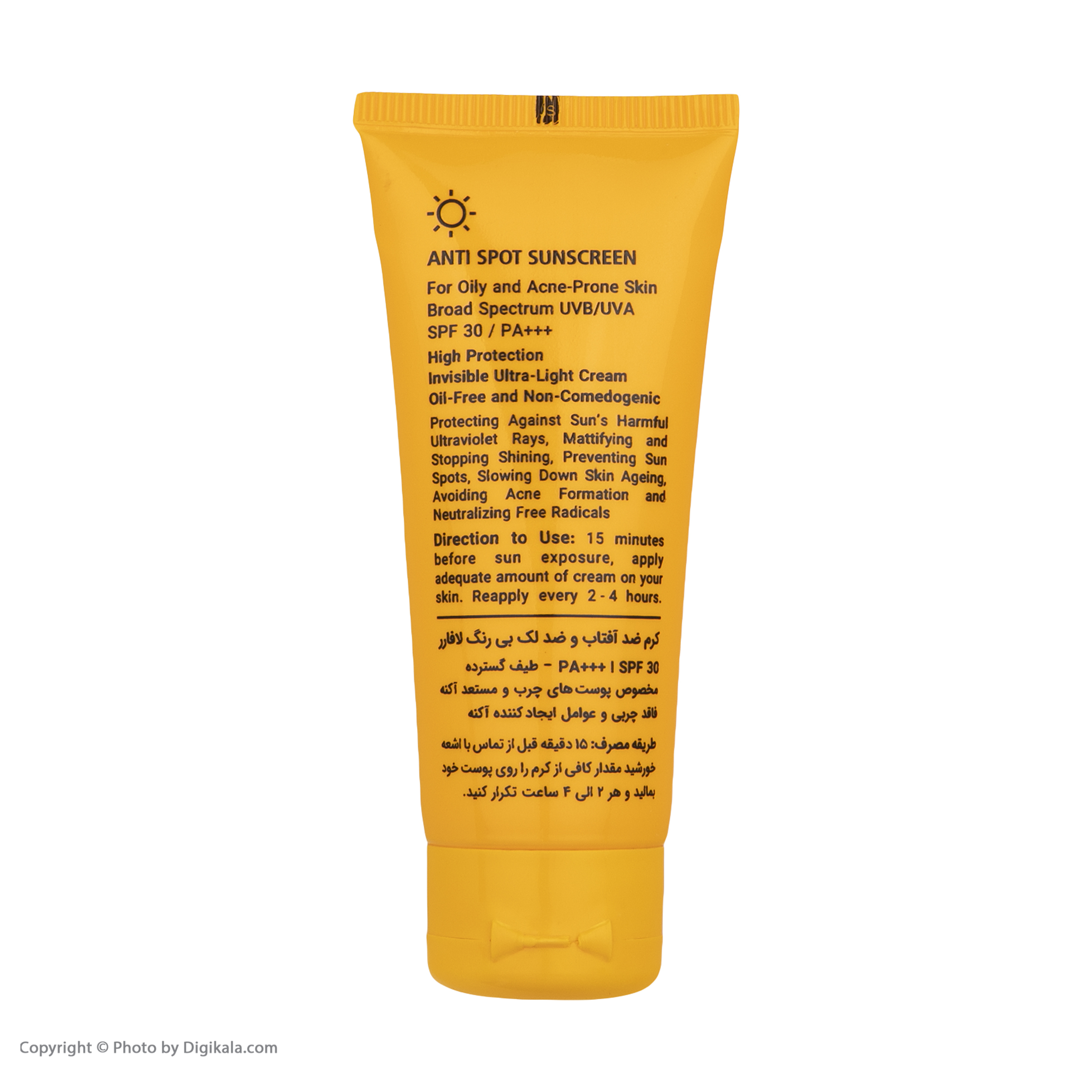این کرم ضدآفتاب بدون رنگ SPF30 که مناسب برای پوست‌های چرب است، از ویژگی‌هایی همچون محافظت کنندگی در برابر اشعه UVA برخوردار است. از آنجا که این کرم قدرت سرشاری در مقابله با چربی پوست دارد، مناسب برای افرادی با این نوع پوست استفاده می‌شود.