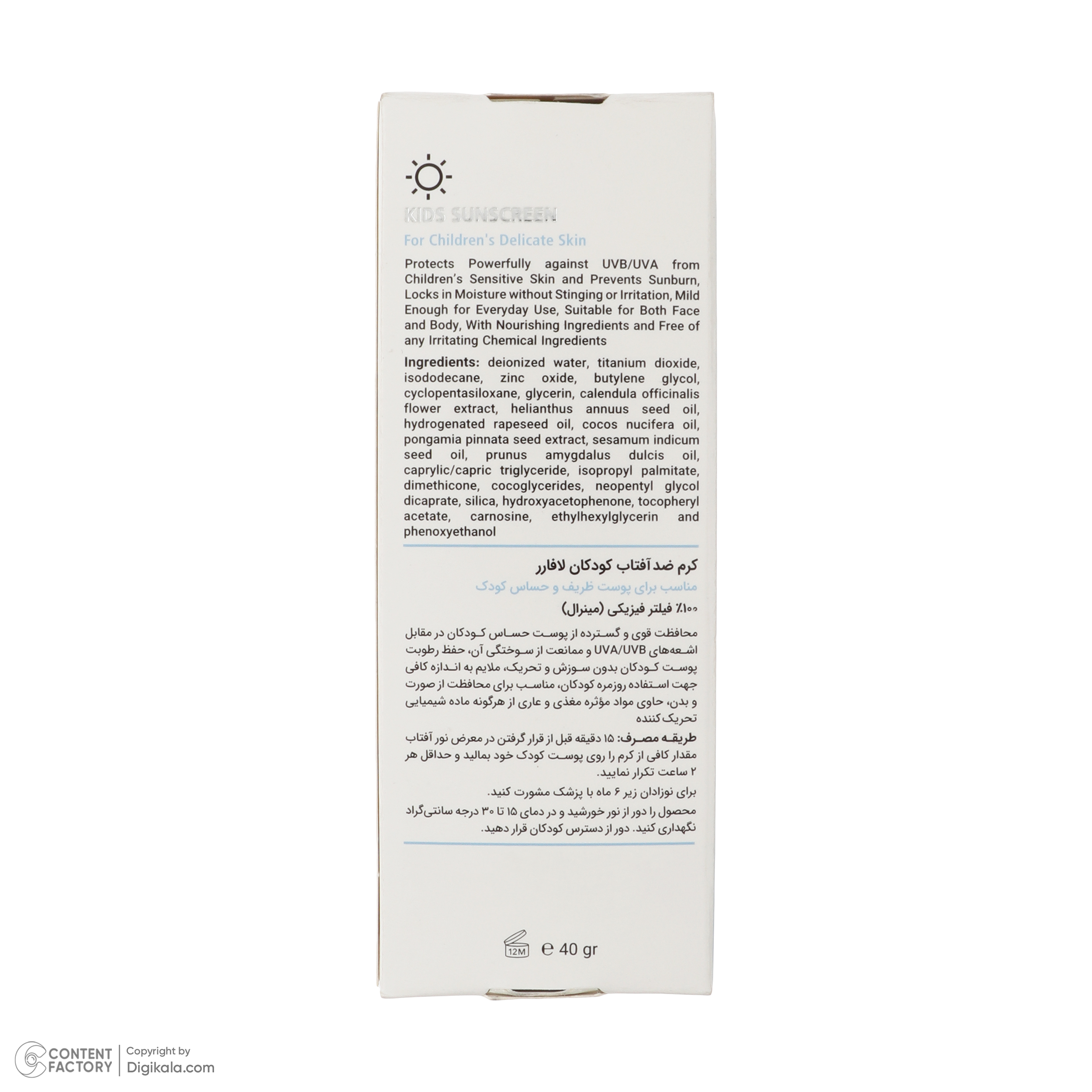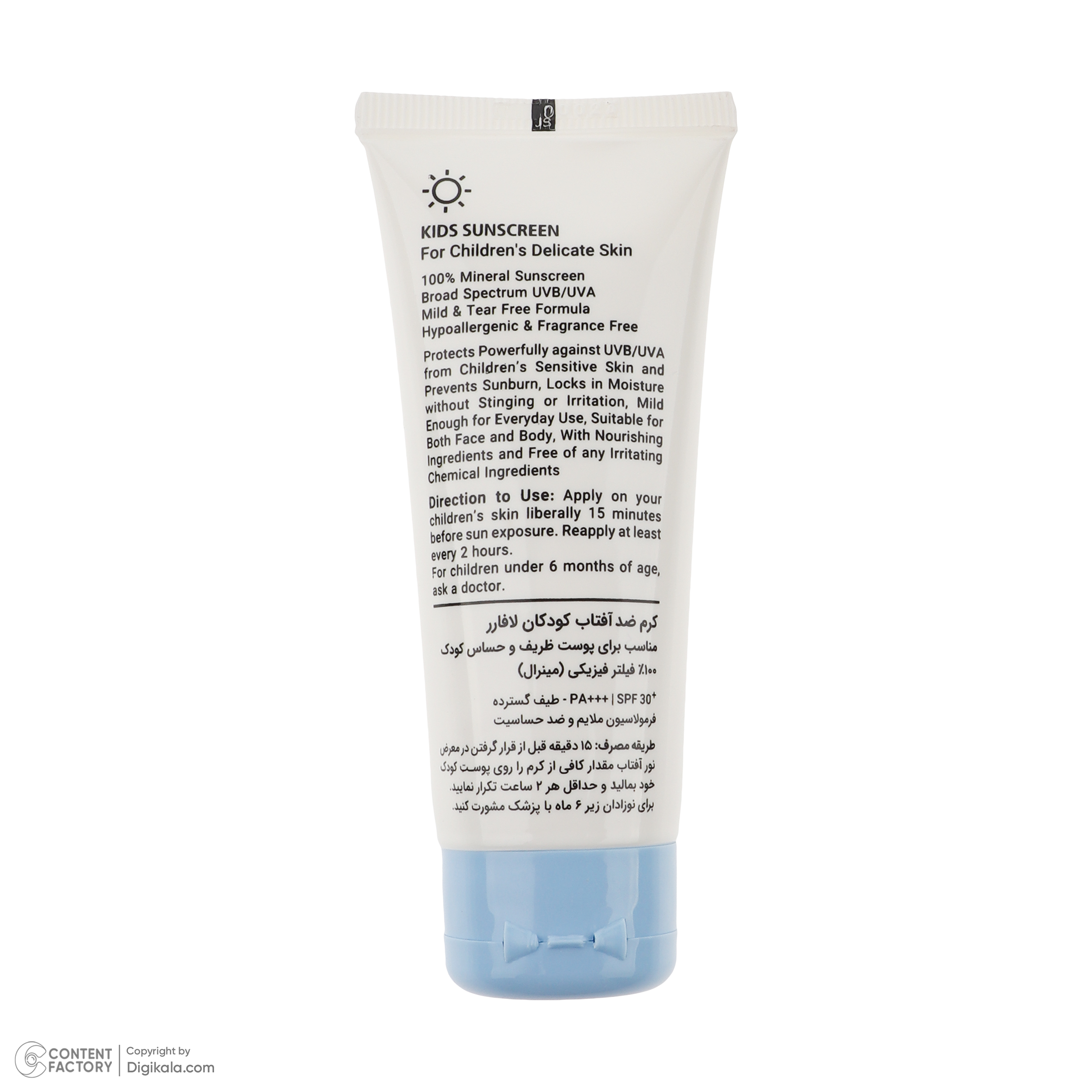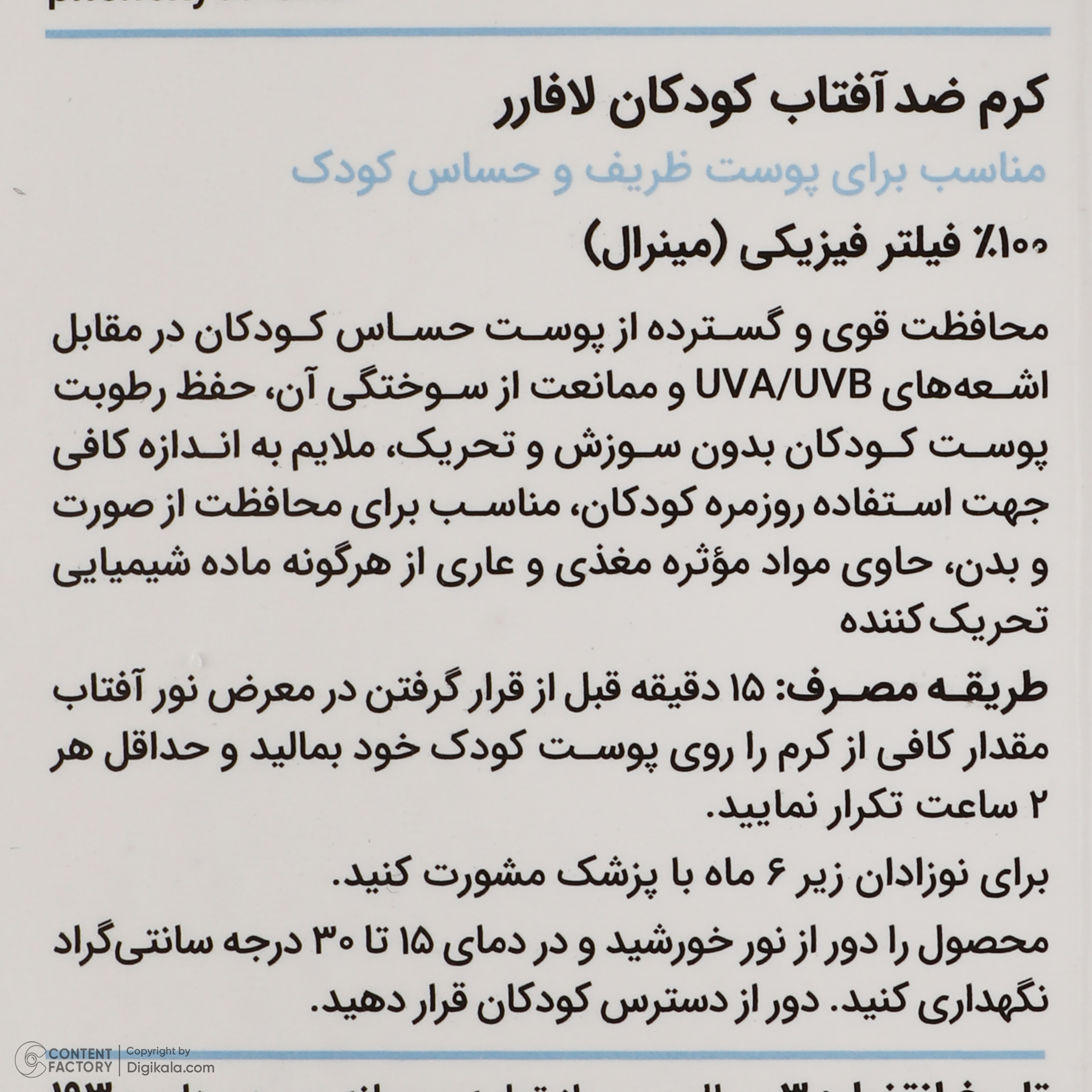 - سایر توضیحاتمناسب برای پوست ظریف و حساس کودک 100% فیلتر فیزیکی (مینرال) SPF30+ PA+++ فرمولاسیون ملایم و ضد حساسیت
