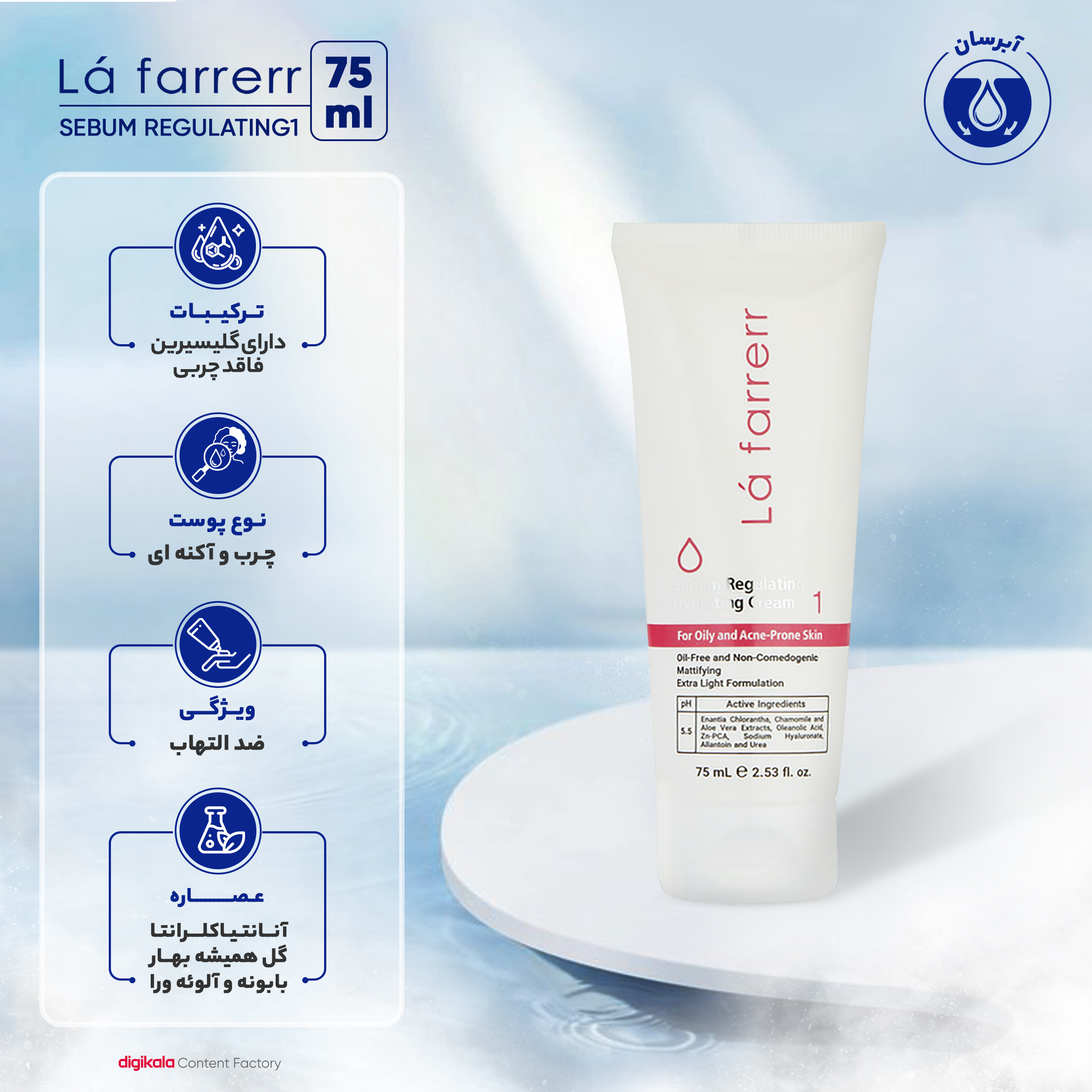 ویژگیهای کرم کنترل کننده چربی و آبرسان لافارر مدل SEBUM REGULATING1 مناسب پوست های چرب و مستعد آکنه حجم 75 میلی لیتر