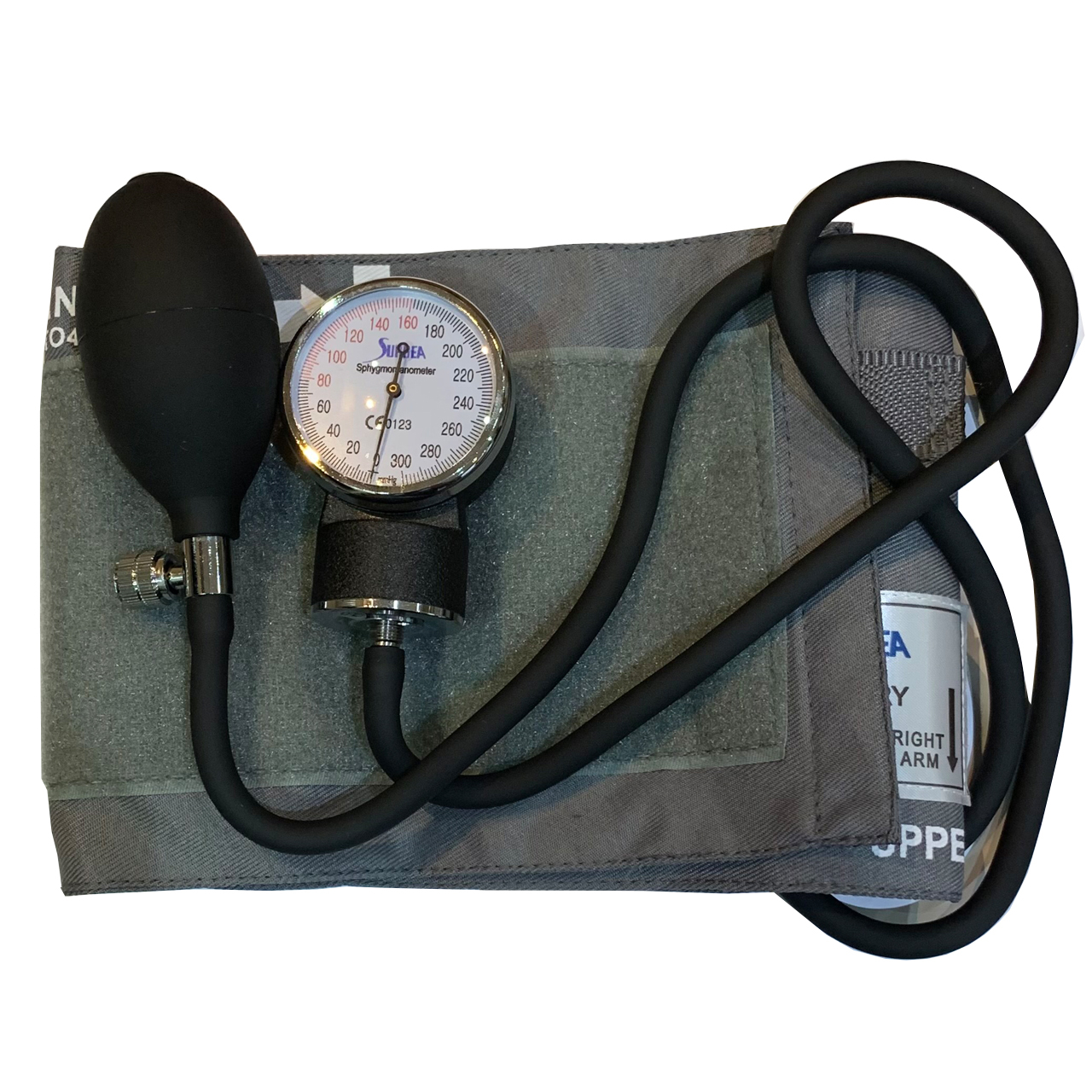 پوار و گیج و گوشی پزشکی ساخته شده از لاتکس بهمراه گوشی پزشکی.4_دارای گیج آلومینیومی کاف نایلونی با D رینگ کاف دو شیلنگ PVC بزرگسال دریچه خروج هوای فنردار دارای کیف حمل فشار سنج
