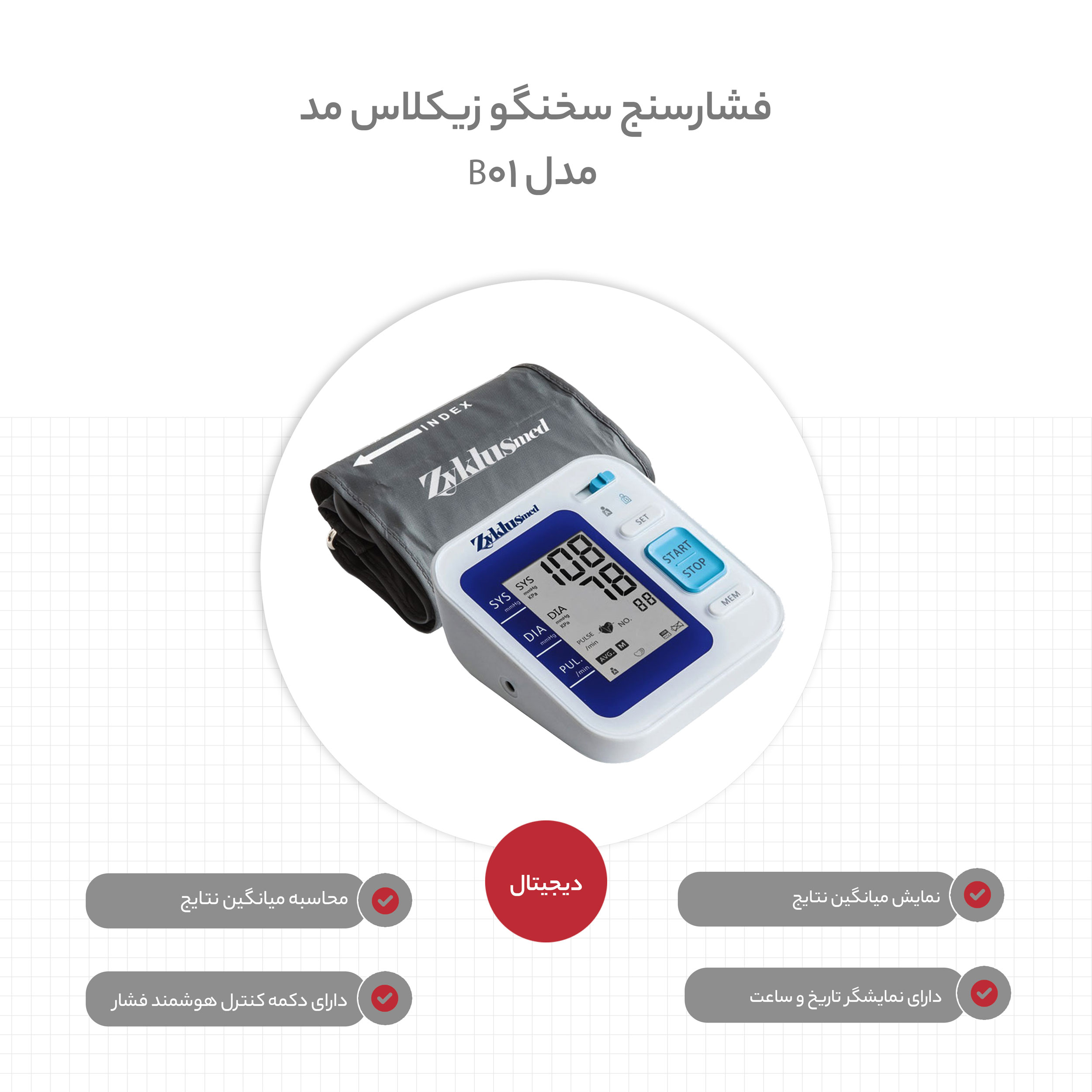 دستگاه فشارخون جز لوازمی است که باید همیشه در منزل وجود داشته باشد. دستگاه‌های فشارخون انواع مختلفی دارند و بسته به نحوه گرفتن فشار متفاوت هستند. دستگاه فشارسنج زیکلاس مد مدل B01 در هنگام گرفتن فشارخون آهنگی پس زمینه اجرا می‌کند که به حفظ آرامش شما کمک کرده و تمرکز شما را بالا می‌برد. این دستگاه سخنگو بوده و بعد از اندازه‌گیری میزان فشارخون آن را اعلام می‌کند؛ بیان این نکته خالی از لطف نیست که، در زمان پخش آهنگ، اعلام اندازه‌گیری فشارخون انجام می‌شود. به منظور رسیدن به نتیجه‌ای دقیق‌تر و بهتر، این دستگاه در 15 ثانیه 3 بار فشار خون شما را اندازه‌گیری می‌کند و در انتها میانگین آن‌را نمایش می‌دهد این قابلیت گزینه‌ای انتخابی بوده و شما می‌توانید در صورت نیاز از آن استفاده کنید. در بسته‌بندی دستگاه فشارسنج زیکلاس مد، یک کیف بادوام و آداپتور برق قرار گرفته است. از دیگر ویژگی‌های این دستگاه می‌توان به داشتن LCD به جهت نمایش میزان فشار و ضربان قلب اشاره کرد.