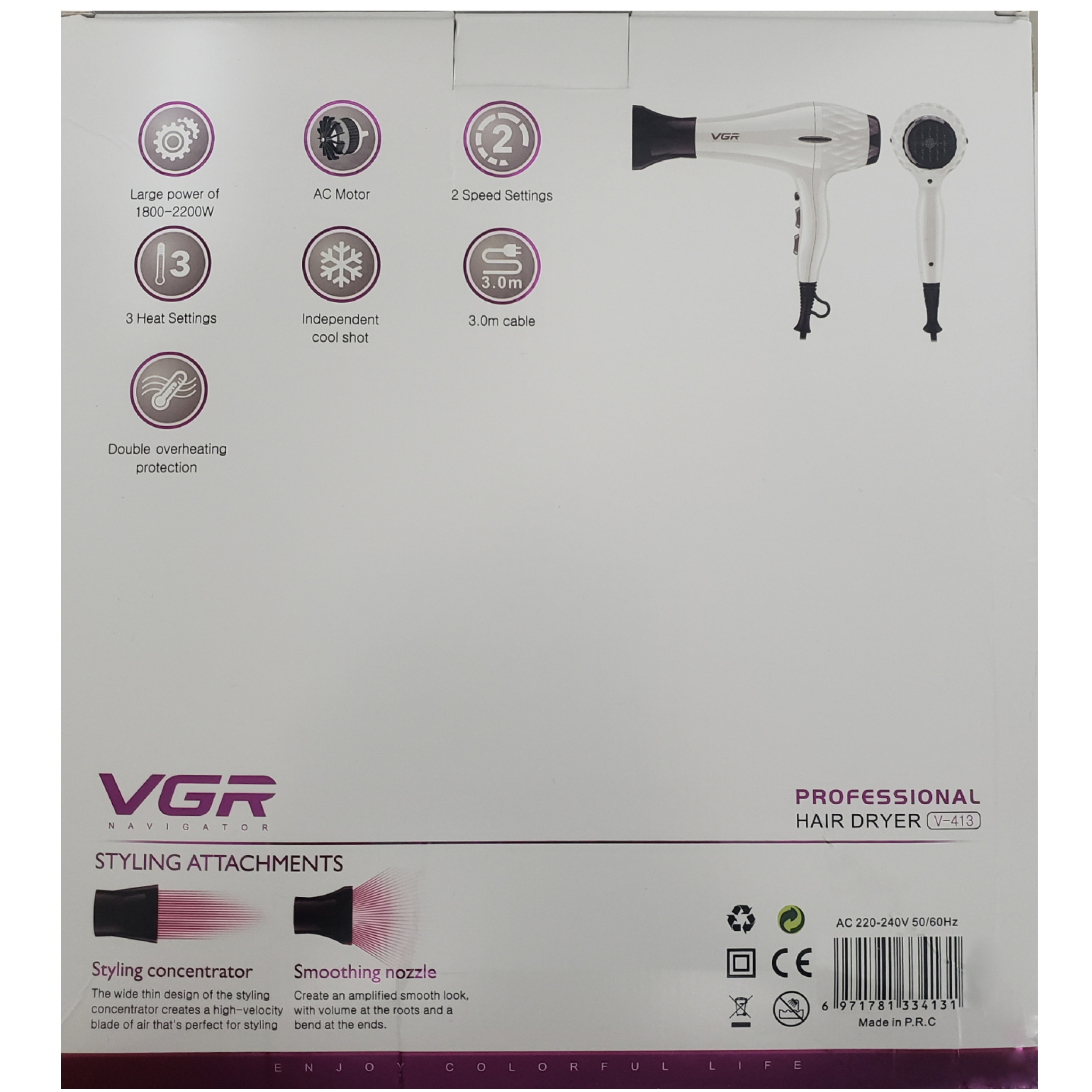 سشوار وی جی آر مدل 413 دو سرعته و دارای2 درجه گرما و تکنولوژی جدید کلید مستقل سرما میباشد قدرت این سشوار 2200 وات و موتور این سشوار AC است طول کابل سشوار 3 متر و قابل استفاده در آرایشگاه و منزل میباشد .