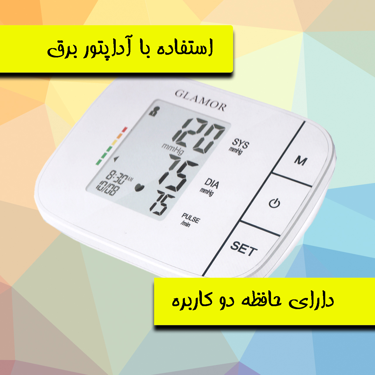 با توجه به خطراتی که با بالا و پایین شدن فشار خون انسان را تهدید میکند، داشتن یک فشارسنج، بسیار ضروری است. از آن جایی که اغلب افراد طریقه اندازهگیری فشارخون را با دستگاه فشارسنج معمولی (عقربهای) را بلد نیستند، توصیه میشود که از دستگاه فشارسنج دیجیتالی که حتما بازویی باشد، استفاده کنند. دستگاه فشارسنج بازویی گلامور Glamor مدل DBP-1209new شامل یک کیف محکم، یک عدد کاف ساده کوچک ( مناسب برای دور بازوی 22 الی 36 سانتی متر)، یک عدد کاف ساده بزرگ (مناسب برای دور بازوی 22 الی 42 سانتی متر)، آداپتور، دستگاه و دفترچه راهنما است. این دستگاه قادر است هم با برق و هم با باتری کار کند؛ باطری درون پکیج موجود نیست. از قابلیتهای این دستگاه میتوان به اندازهگیری دقیق فشار خون به صورت 180 ضربه در دقیقه و میزان فشار خون را از 30 تا 250 میلیمتر جیوه نشان میدهد. همچنین این فشارسنج دارای حافظه است و میتواند برای دوکاربر مجزا تا 60 بار میزان حافظه بیمار را در خود ذخیره کند.فشارسنجهای دیجیتال به دلیل دقت بالاتر و سرعت بیشتر در اندازهگیری فشار خون، انتخاب بسیاری از افراد میشوند. این دستگاهها معمولا دارای صفحه نمایش دیجیتال هستند که به صورت دقیق و روشن اطلاعات اندازهگیری شده را نمایش میدهند، در حالی که فشارسنجهای آنالوگ بیشتر بر پایه خوانایی نوک قلمی و نشانگرهای متحرک عمل میکنند. نحوه کار با فشارسنج دیجیتال بازرویی گلامور این فشارسنج دیجیتال بازرویی گلامور با استفاده از تکنولوژی برتر، قادر به اندازهگیری دقیق فشار خون است. با استفاده از سنسورهای حساس و پیشرفته، این دستگاه تغییرات فشار خون را به صورت دقیق نمایش میدهد و به شما امکان میدهد تا وضعیت سلامت خود را بررسی کنید. برای استفاده از این فشارسنج، ابتدا باید دستگاه را روشن کرده و منبع تغذیه آن را اتصال دهید. سپس باید منبع تغذیه را به درستی قرار داده و منبع نوری مناسب فراهم کنید تا بتوانید نتایج را به صورت واضح مشاهده کنید. سپس آرنج خود را روی میز قرار داده و منبع نوری را به دستگاه متصل کنید. با فشردن دکمه شروع، دستگاه شروع به اندازهگیری فشار خون میکند و نتایج را نمایش میدهد.