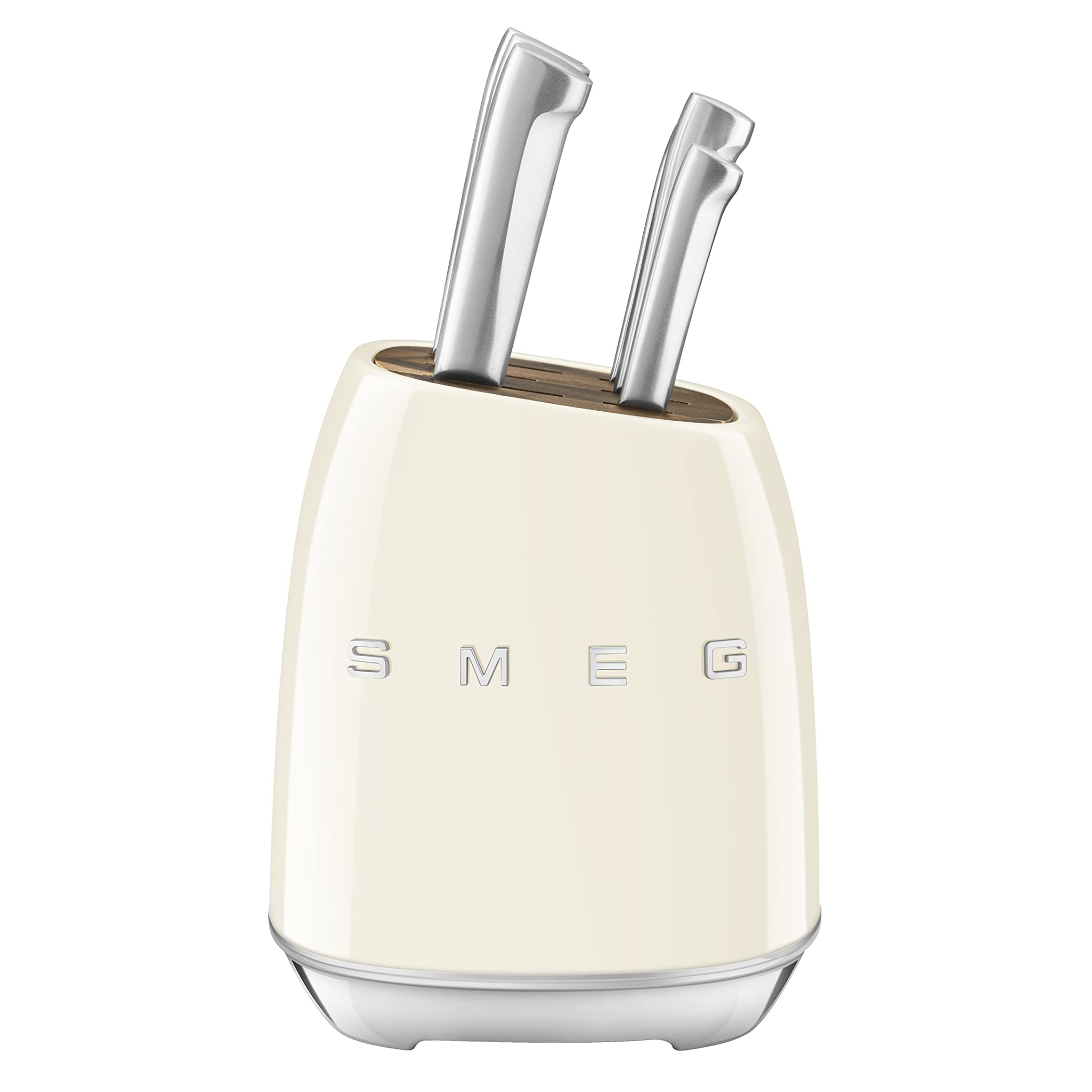 با این ست بلوک چاقو 7 تکه ، استایل کلاسیک SMEG و ظاهری قدیمی دهه 1950 را به میز آشپزخانه خود بیاورید! بلوک چاقوی چوب اقاقیا دارای بدنه بیرونی فولاد کربنی با پوشش پولیش است که به راحتی تمیز میشود و به رنگ کرم براق پوشیده شده است برای هماهنگی با سایر لوازم SMEG رنگ است.پایههای ضد لغزش مانع از لغزش بلوک در هنگام برداشتن چاقو میشوند. چاقوهای این مجموعه دارای تیغه های با کیفیت استیل ضد زنگ آلمانی و دسته های فولادی ضد زنگ صیقلی و بسیار بادوام هستند و برای کارهای روزمره برش انواع مواد غذایی آماده هستند. این مجموعه شامل چاقوی سبزیجات، چاقوی همه کاره، چاقوی گوشت، چاقوی سانتوکو، چاقوی نان و چاقوی آشپز می باشد.