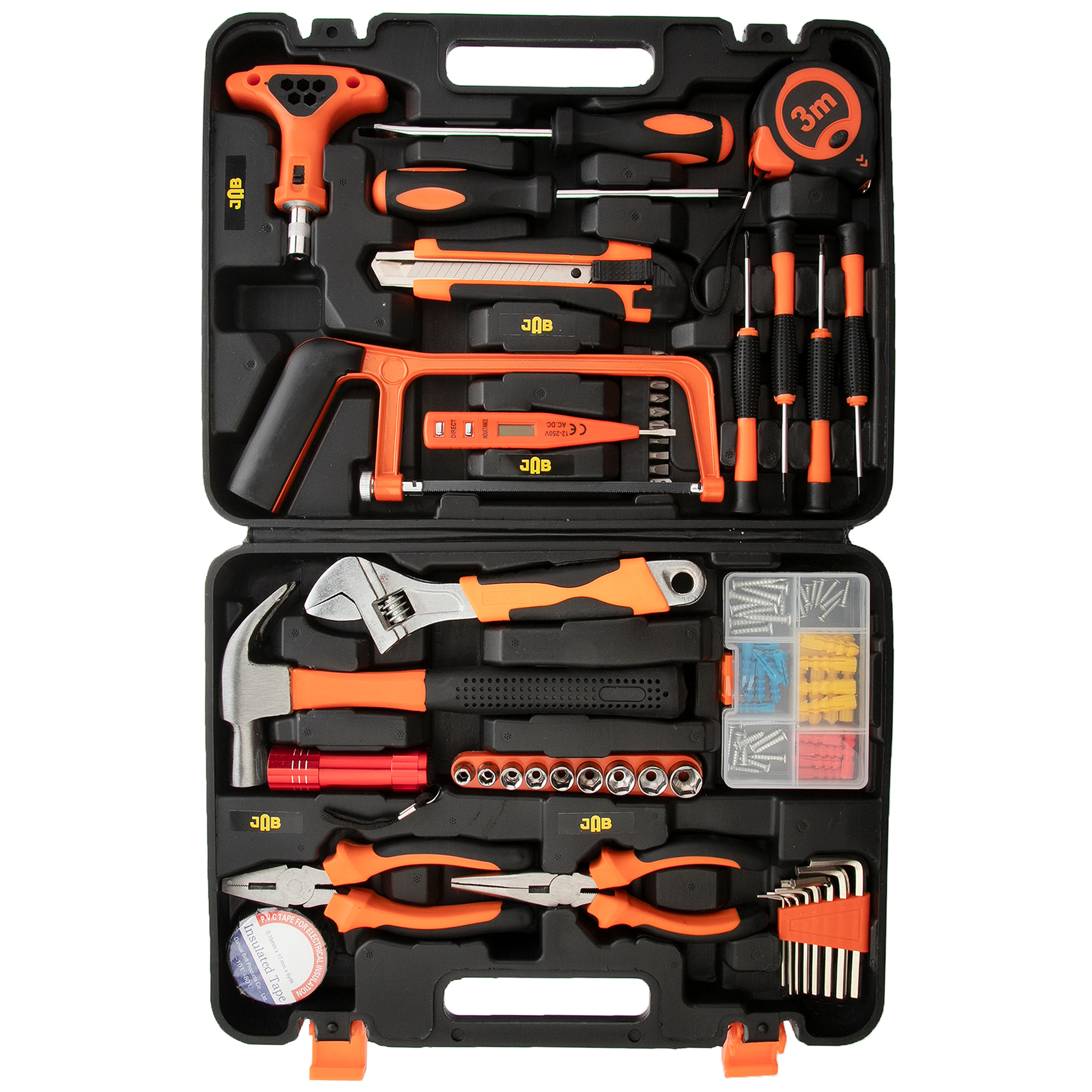 1 عدد پیچ گوشتی دوسو 1 عدد پیچ گوشتی چهارسو 4 عدد پیچگوشتی ساعتی آچار آلن از سایز 2 تا 10 (8 عدد) 1 عدد فازمتر یا تستر الکتریکی 1 عدد کاتر 1 عدد لنت برق 1 عدد متر 3 متری 1 عدد انبردست 1 عدد دم باریک 1 عدد چراغ قوه 1 عدد آچار فرانسه 1 عدد چکش دارای مجموعه 18 عددی بکس 1 عدد اره دارای جعبه انواع پیچ و رولپلاک BMC دارای کیف حمل وزن: 3 کیلوگرم