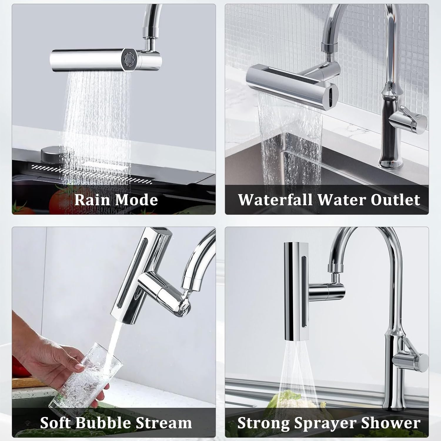 این شیر آب دارای چهار حالت مختلف است که می تواند آب را به صورت آبشاری، بارانی، یک شاخه و دو شاخه خارج کند. این حالات را می توانید در عکس ها مشاهده کنید.